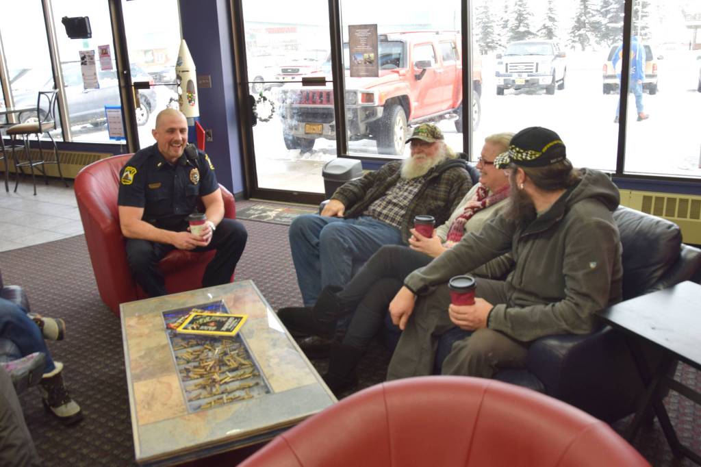 Lt. Ben Langham of the Kenai Police Department shares a laugh with members of the community at Ammo Can Coffee in Soldotna on Wednesday, Jan. 30, 2019. (Photo by Brian Mazurek/Peninsula Clarion)