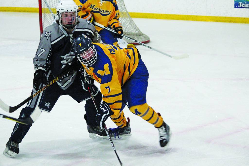 Homer’s Tyler Gilliland and Soldotna’s Wyatt Medcoff jockey for position during a Wednesday, Jan. 15, 2020 hockey game at Kevin Bell Arena in Homer, Alaska. (Photo by Megan Pacer/Homer News)