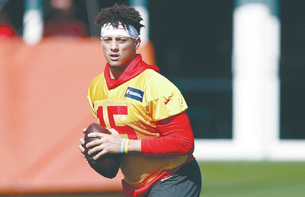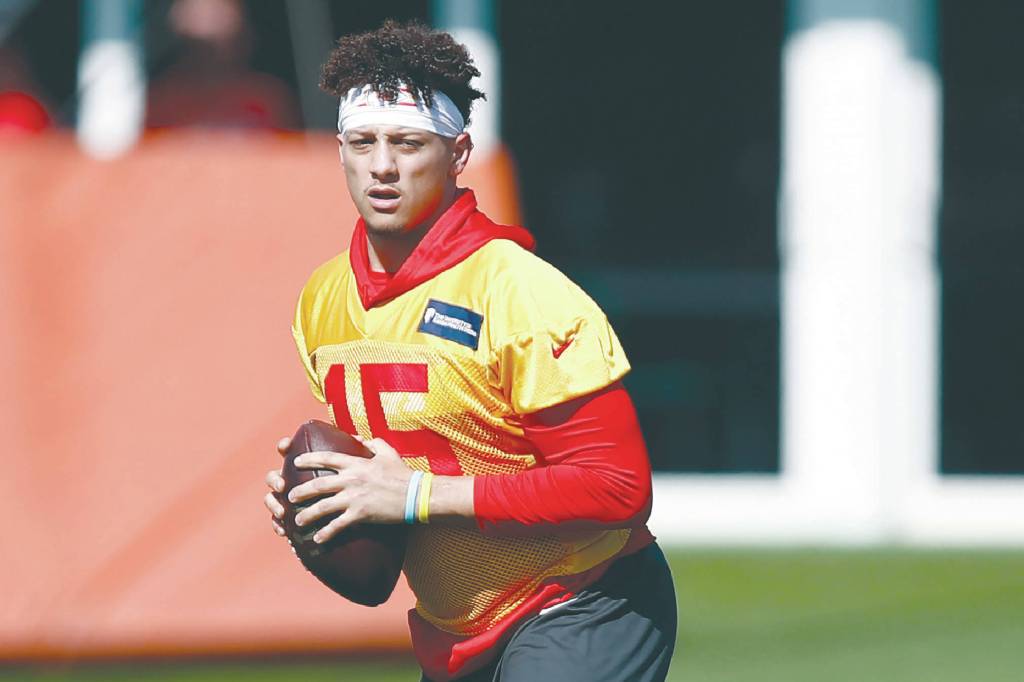 Kansas City Chiefs quarterback Patrick Mahomes (15) runs drills during practice on Wednesday, Jan. 29, 2020, in Davie, Fla., for the NFL Super Bowl 54 football game. (AP Photo/Brynn Anderson)