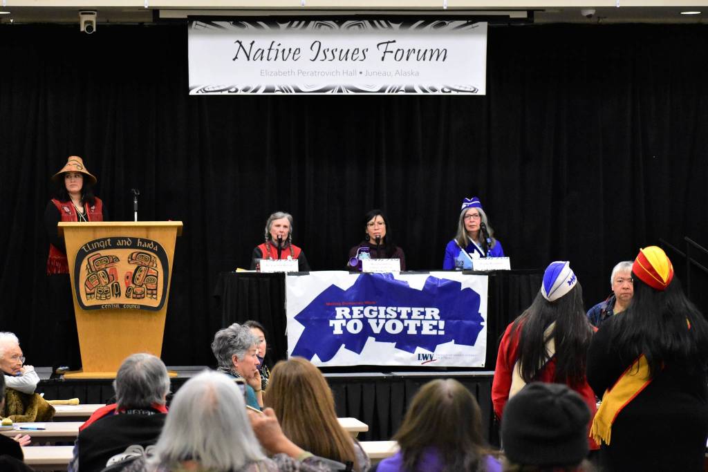 The panel at the Native Issues Forum at Elizabeth Peratrovich Hall on Monday. (Peter Segall | Juneau Empire)