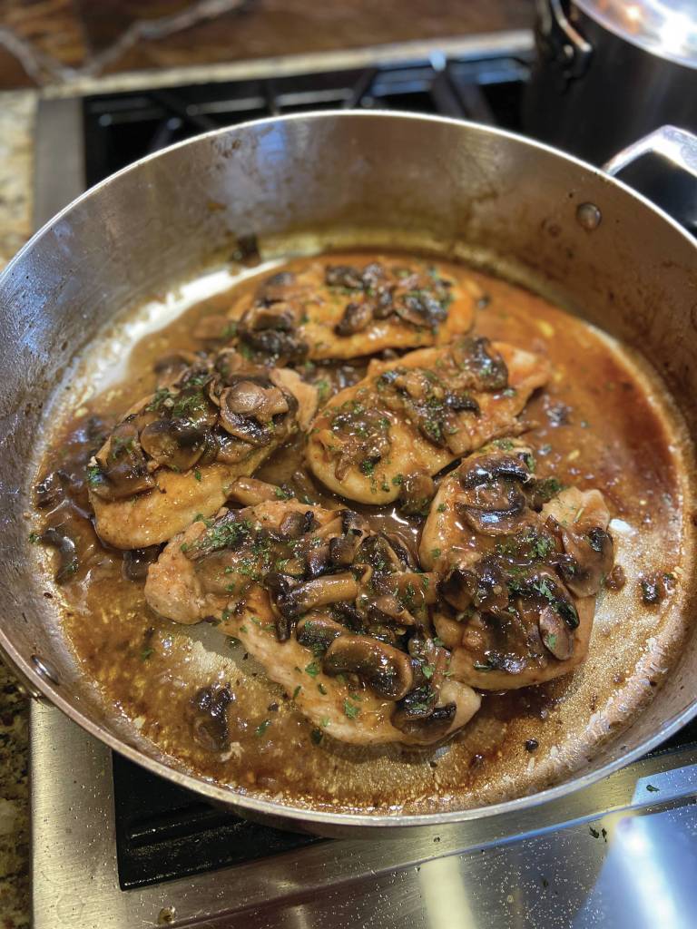 6. When the second batch of chicken is done and removed from the pan, pour about one-third of the Marsala mixture into the pan, scraping the pan with a wooden or silicone spatula to scrape up the browned bits, then add the rest of the Marsala mixture, as well as the mushrooms and chicken pieces.