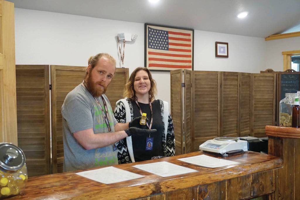 In a classic log building with a front porch, Alaskan Cannabis Outfitters has the look of a sourdough tourist shop. That was his dad’s concept, Micah Bear said. The shop features a lot of Alaska memorabilia, like a 49-star American flag. It has a simple layout, with one door for entrance and one for exit so traffic moves in one direction. People enter at a hallway where budtenders check identification — under Alaska law, you have to be age 21 to enter — and, in the new age of the COVID-19 pandemic, the staff can monitor the number of people who enter so no more than three are inside at one time. That gives plenty of room for staying 6-feet apart. Thanks to Frontier CBD, a Homer manufacturer, the shop has adequate supplies of hand sanitizer.