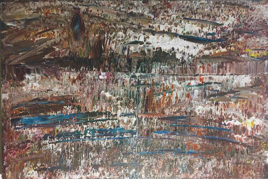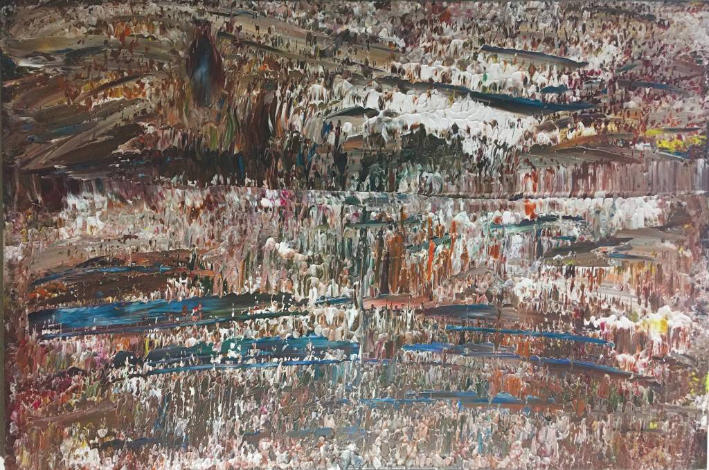 I make those paintings on nights when I have given up and find my canvas unsalvageable, scraping all the paint into a pile. In the worst case my canvas ends in the bathtub, hosed down under the shower in an effort to disappear the ugly.