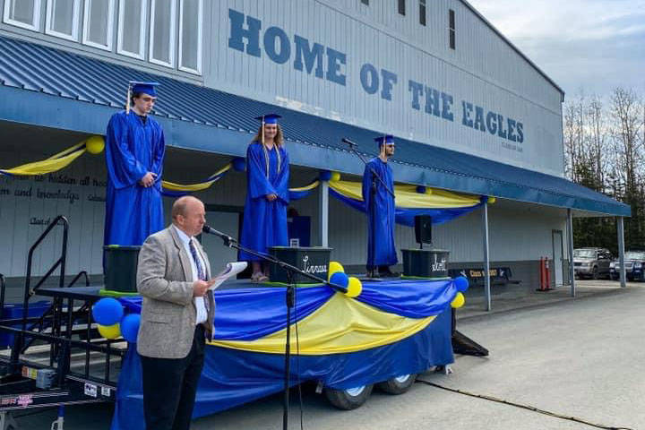 Cook Inlet Academy graduated three students — Robert Walsh, Scott Loehr and Linnanae Dohse — at a May 9 drive-in ceremony. Attendees at the event, which was organized to follow Centers for Disease Control and Prevention guidelines, were required to stay in their vehicles at all times, Karen McGahan, Cook Inlet Academy School Board member, said.