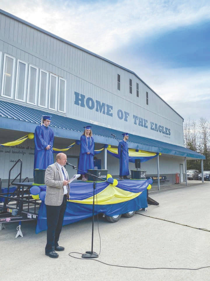 School board President Kristi Dillingham welcomed attendees and offered the opening prayer. Robert Walsh led pledges. Kenny Leaf, a science teacher at Cook Inlet Academy, served as the main speaker. McGahan said the parking lot was full, with cars decorated in the school colors of blue and gold. Instead of clapping, attendees honked car horns. Each student’s parents presented them with their diplomas and a parade followed the ceremony on a route through the city of Soldotna.