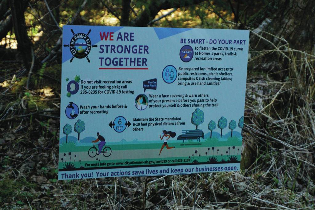A sign at the Pratt Museum’s nature trail on May 15, 2020, in Homer, Alaska, is part of the City of Homer’s campaign to increase awareness of precautions to take during the COVID-19 pandemic. (Photo by Michael Armstrong/Homer News)