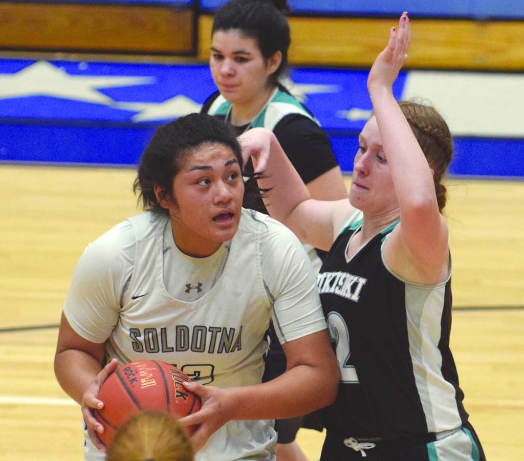 Soldotna’s Ituau Tuisaula powers up against Nikiski’s Kaycee Bostic on Tuesday, Jan. 21, 2020, at Soldotna High School in Soldotna, Alaska. (Photo by Jeff Helminiak/Peninsula Clarion)