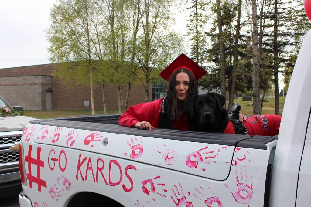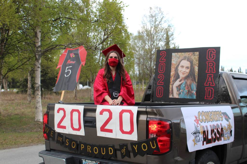 The parade started at Mountainview Elementary, where all 80 graduates lined up in their cars with their family members. The cars were decked out in bright red balloons, signs and streamers, and many of the graduates sat in their truck beds or stood up through their sun roofs as they passed through a few neighborhoods and waved to Kenai residents who came outside to cheer them on.