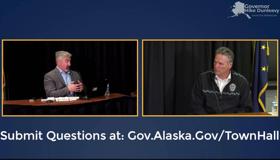 Dunleavy’s Director of Community Relations Dave Stieren facilitated Thursday’s town hall, which featured Dunleavy, Chief Medical Officer Dr. Anne Zink; Department of Health and Social Services Commissioner Adam Crum; Department of Commerce, Community and Economic Development Commissioner Julie Anderson and Department of Labor and Workforce Development Commissioner Tamika Ledbetter.