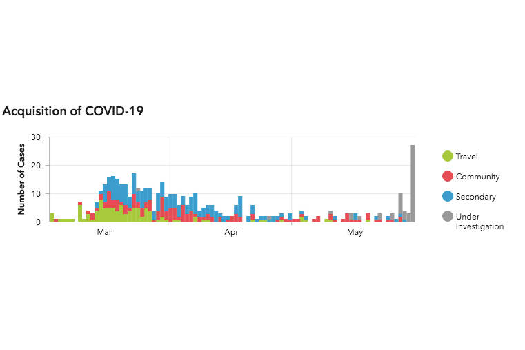 A graph by the Alaska Department of Health and Social Services created on its Coronavirus Datahub on Sunday, May 31, 2020, shows the number of positive COVID-19 cases acquired by day since the first cases were recorded in March. The increase of 27 cases on May 31 marks the largest single jump in one day in Alaska. (Graphic courtesy of Alaska Department of Health and Social Services)