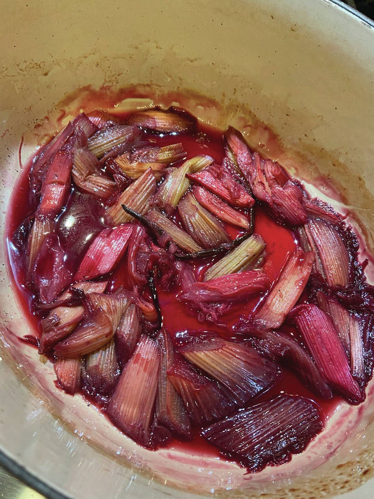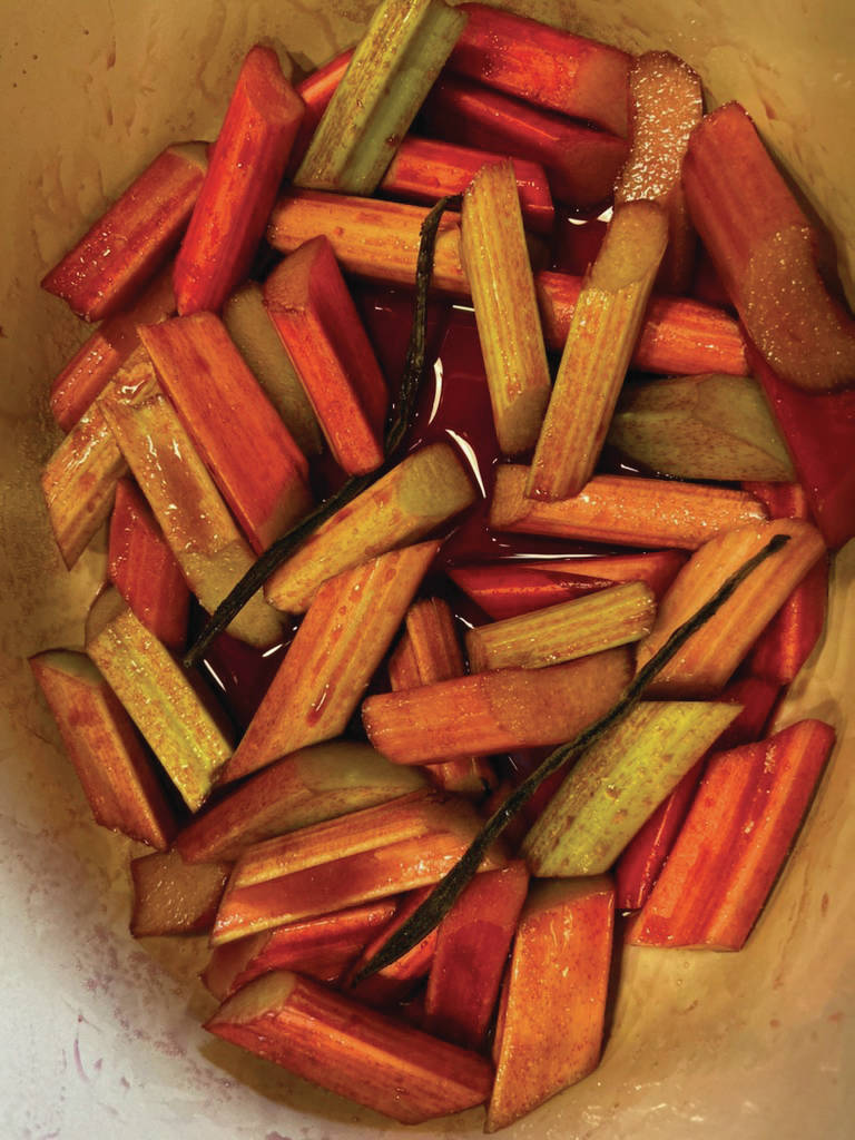 Pre-heat oven to 350°. Thickly slice 2 pounds of rhubarb and put it into a deep oven-proof pan or pot. Add ½ cup of sugar, ½ cup red wine and a pinch of salt. Split open 1 or 2 vanilla beans and add them to the rhubarb. Roast the rhubarb until very tender, about 30 minutes. Makes 2-3 cups.