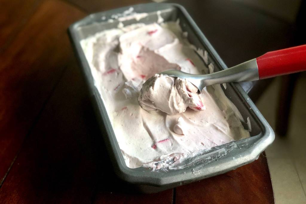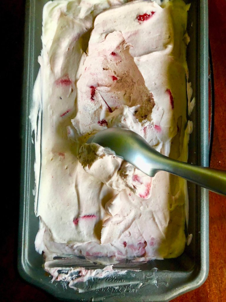 You’ll need a mixer to whip the heavy whipping cream, and a vessel to freeze the mix in. I used a loaf pan, but any metal or glass pan will do.