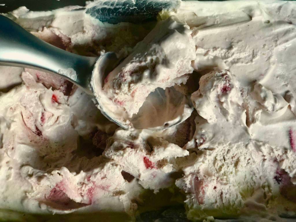 Rhubarb preserves in cardamom spiced ice cream are pictured in this Wednesday, June 10, 2020, in Anchorage, Alaska. (Photo by Victoria Petersen/Peninsula Clarion)