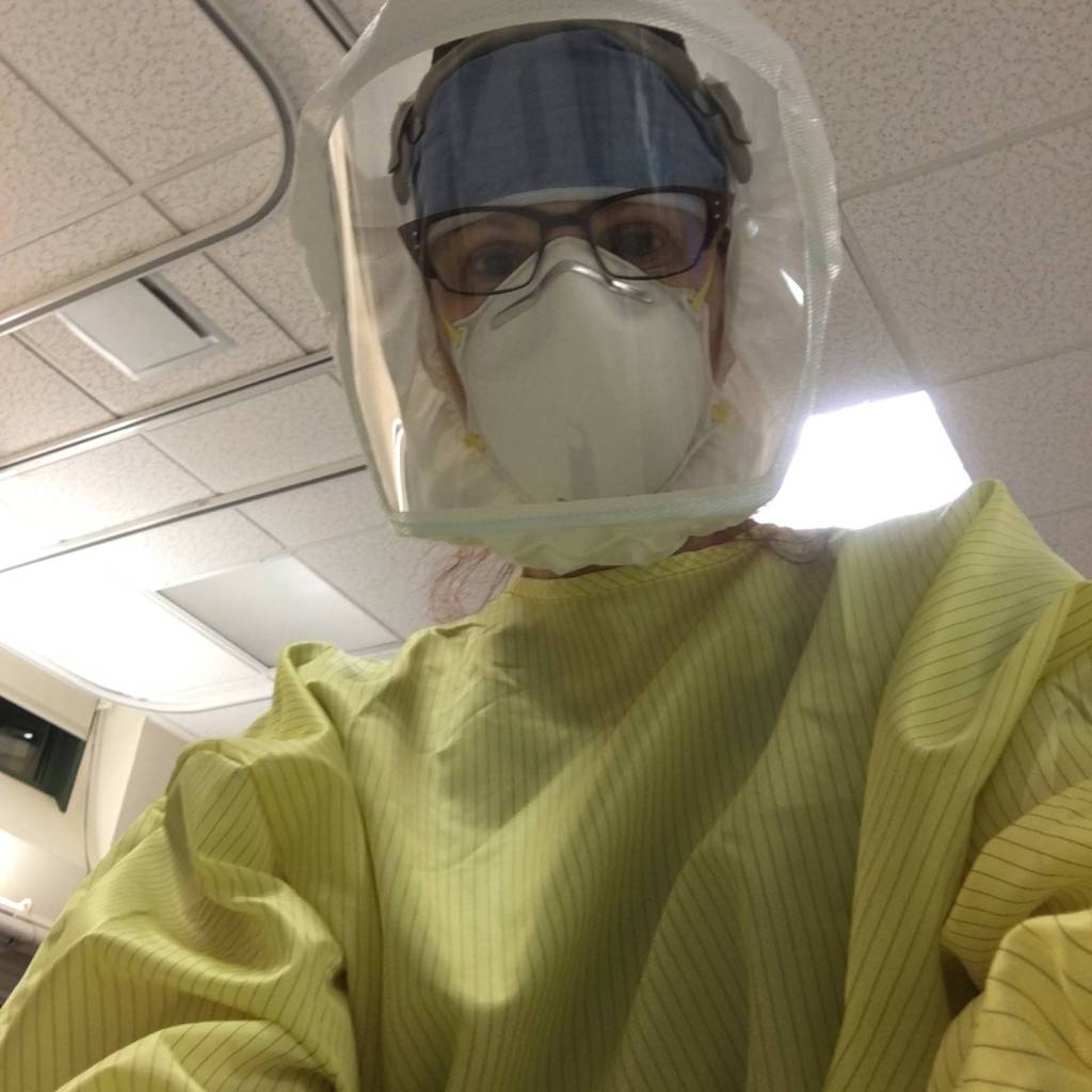 On her first day, Richardson was temperature-checked and given some N95 respirator masks at the entrance of the hospital and told to report to the ambulatory surgery area. There, a separate room was designated for donning all of the necessary personal protective equipment (PPE): a PAPR respirator mask, disposable head cap, gloves, feet covers, leg covers and a heavy plastic gown that came down past the knees.