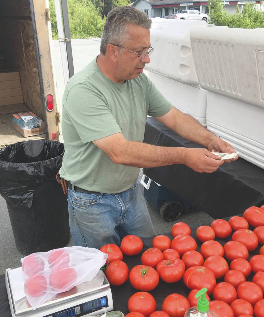 Sterling’s Alex Villa of Valley’s Bounty Produce had tomatoes and cucumbers set up Wednesday. Villa said produce right now is coming from family in the Valley, but some of the things he is growing locally will soon be available.
