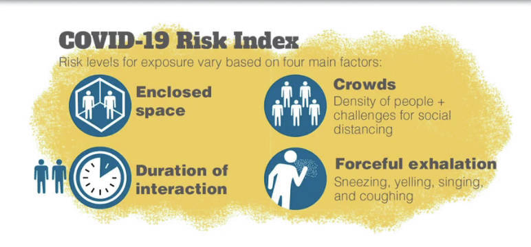 In a Facebook live video, Zink also showed a chart of the COVID-19 risk index. The risk of getting the virus increases in enclosed spaces, with duration of interaction, in crowds, and in areas with forced exhalation such as coughing, sneezing, yelling and singing. When indoors, she encouraged people to open windows or meet people outside.