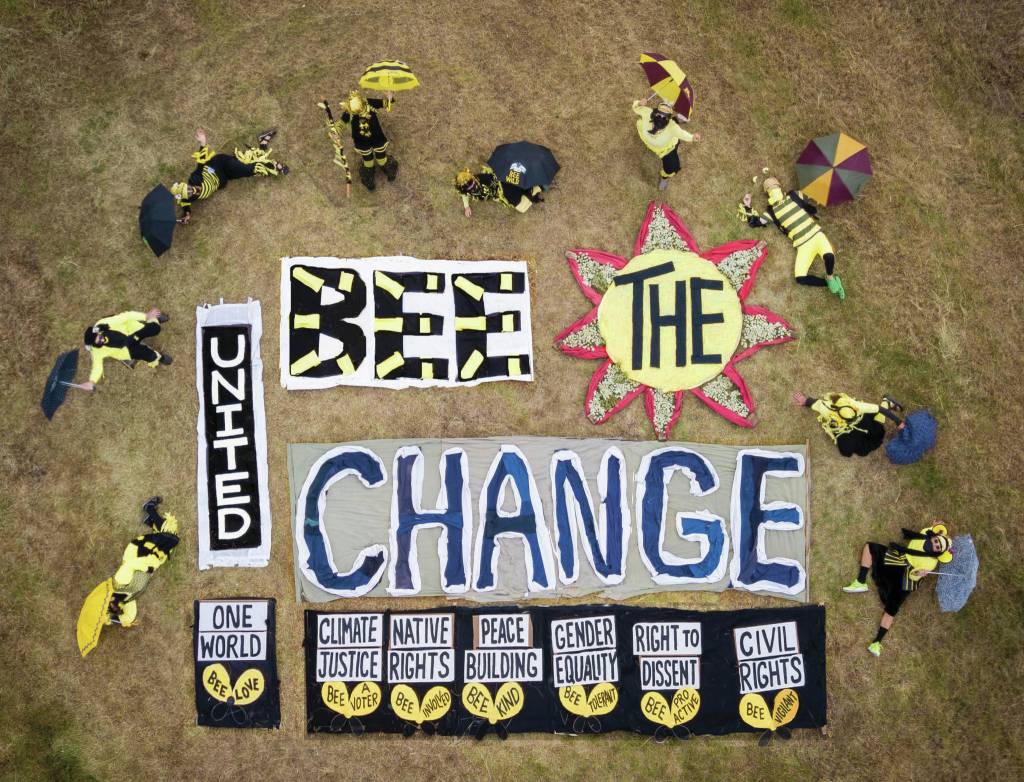 The seven participants dressed in bee costumes as they placed the fabric on the ground. They held signs or had messages written on their wings that said “Climate Justice; Bee a Voter,” “Native rights; Bee Involved,” “Peace Building; Bee kind,” “Gender Equality; Bee Tolerant,” “Right to Dissent; Bee Proactive,” “Civil Rights; Bee Vigilant,” “One World; BEE Love” and “With support energy of Bee Safe, Bee Good, Bee Nice, Bee Here Now.”