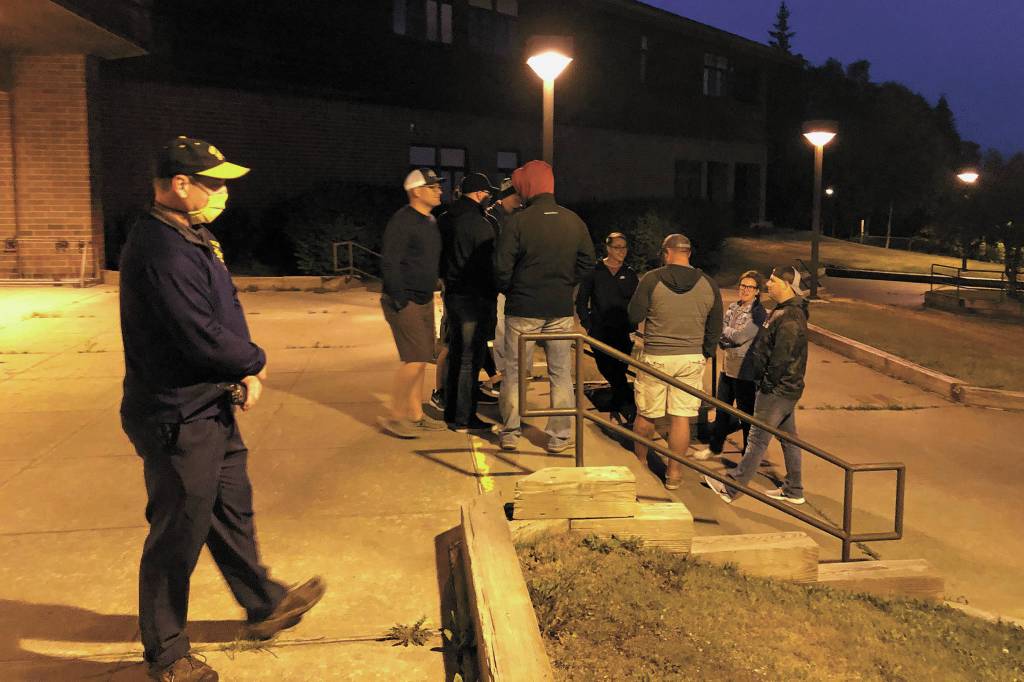 Homer High School Principal Douglas Waclawski (left) stands at the entrance to the local high school while residents show up in search of higher ground in the early morning hours of Wednesday, July 22, 2020 in Homer, Alaska. Homer High School is the designated evacuation location for those below the inundation zone with nowhere else to evacuate to during a tsunami warning. (Photo by Megan Pacer/Homer News)