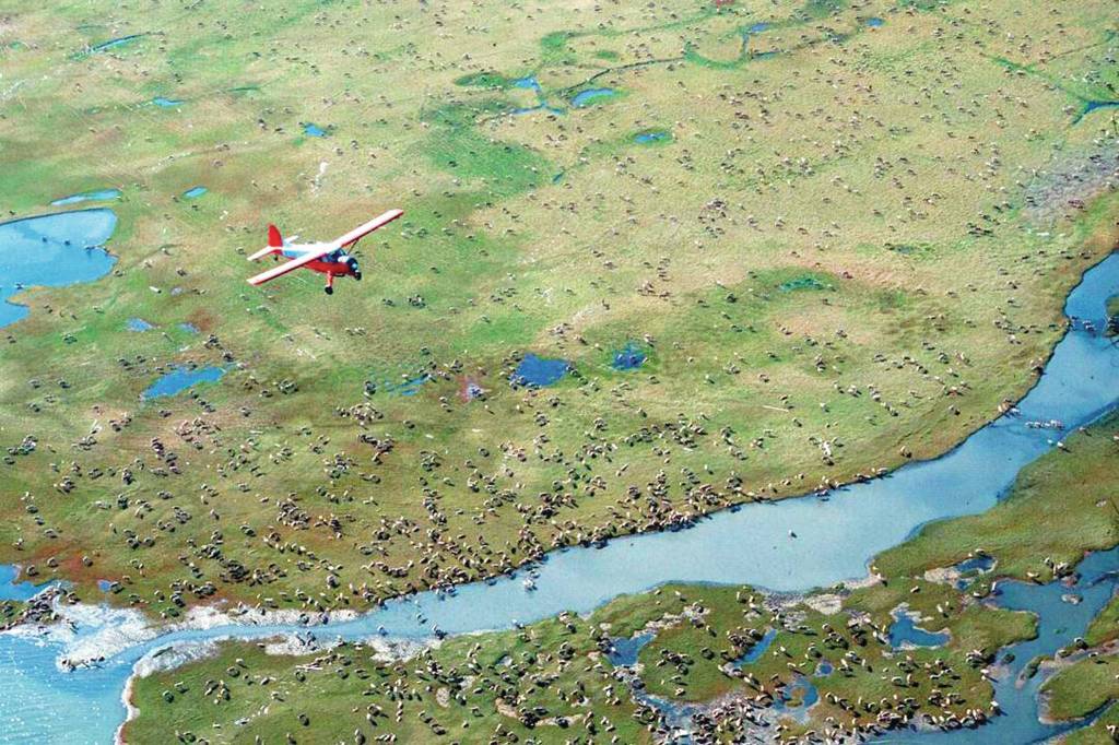 In this undated photo provided by the U.S. Fish and Wildlife Service, an airplane flies over caribou from the Porcupine Caribou Herd on the coastal plain of the Arctic National Wildlife Refuge in northeast Alaska.The Department of the Interior has approved an oil and gas leasing program within Alaska’s Arctic National Wildlife Refuge. The refuge is home to polar bears, caribou and other wildlife. Secretary of the Interior David Bernhardt signed the Record of Decision, which will determine where oil and gas leasing will take place in the refuge’s coastal plain. (U.S. Fish and Wildlife Service via AP)