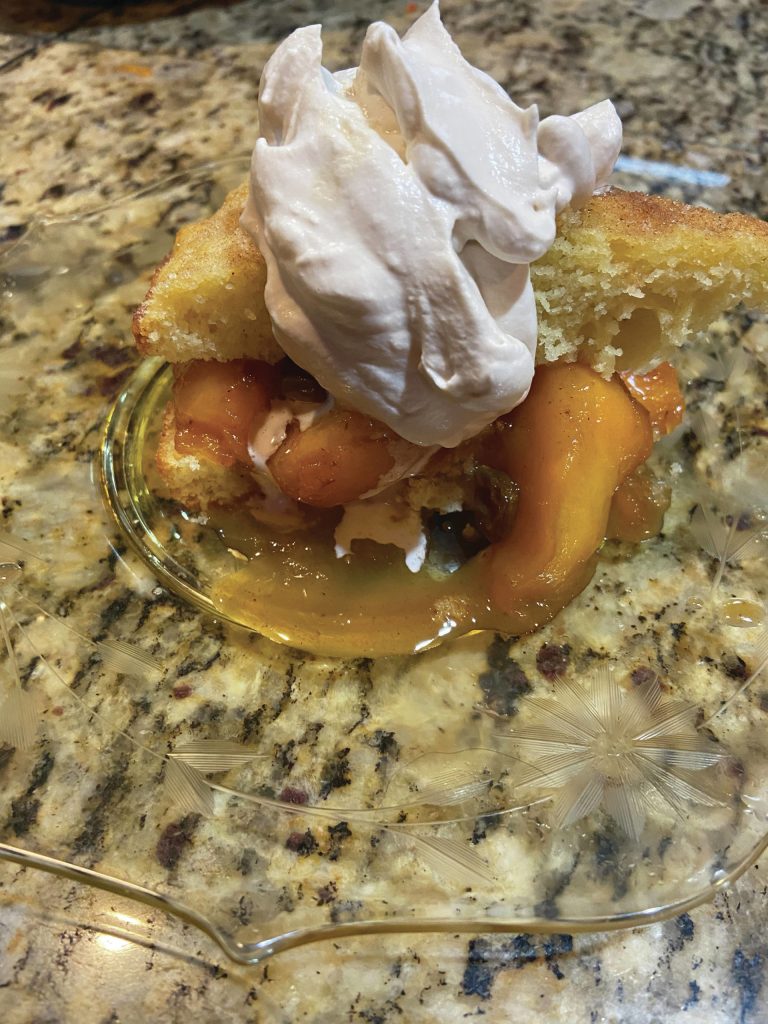 A generous dollop of whipped cream tops off peach cobbler, as seen here on Aug. 1, 2020, in Teri Robl’s Homer, Alaska, kitchen. (Photo by Teri Robl)