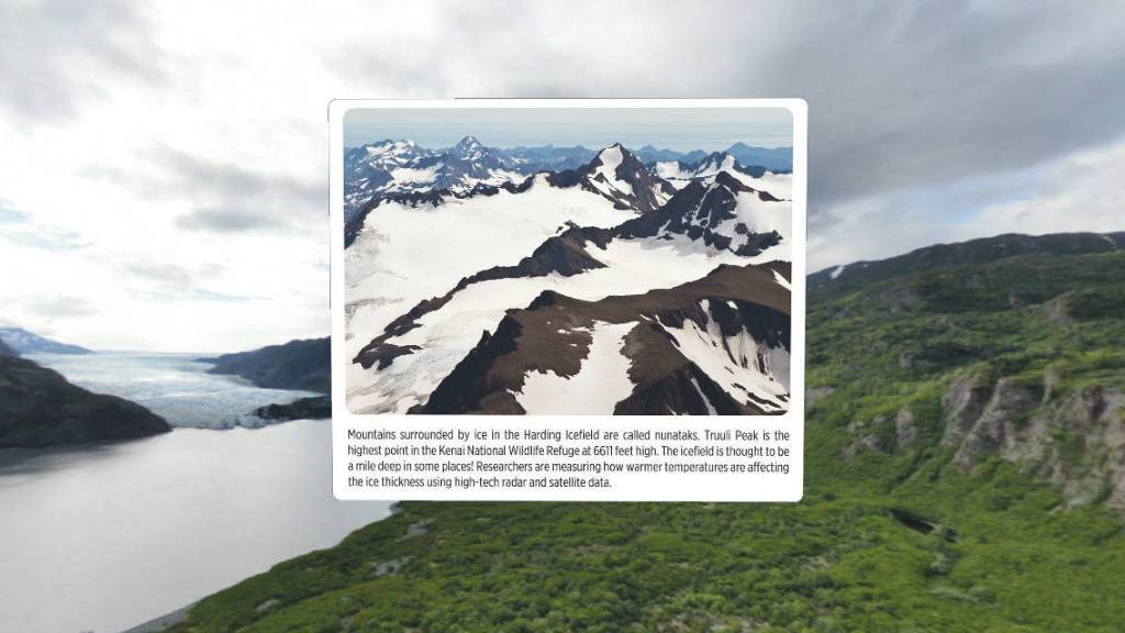 The user can then gaze at one of three icons in the visitor center and be transported to 360-degree, virtual-reality experiences at Tustumena Glacier, Paddle Lake or Skyline Trail.
