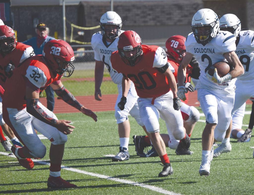 Senior Josh Heiber got Soldotna started by returning the opening kickoff 80 yards for a score. Heiber is out for football for the first time since his freshman year, but anyone who has watched his speed and elusiveness for the SoHi soccer team was not surprised by the return.