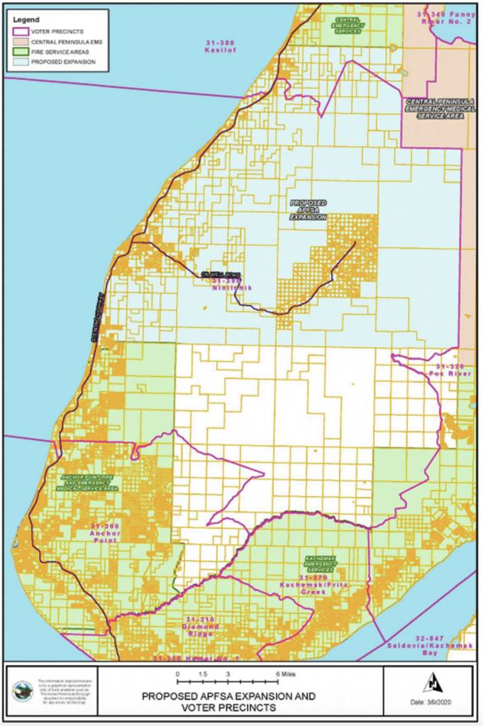The proposed boundaries of the new service area, which stretch from the end of the Central Emergency Services southern boundary to the northern boundary of Kachemak Emergency Services, also stretch out into Cook Inlet. This was done on purpose, Johnson has said, to include oil and gas properties in the service area, which would also contribute to the mill rate.
