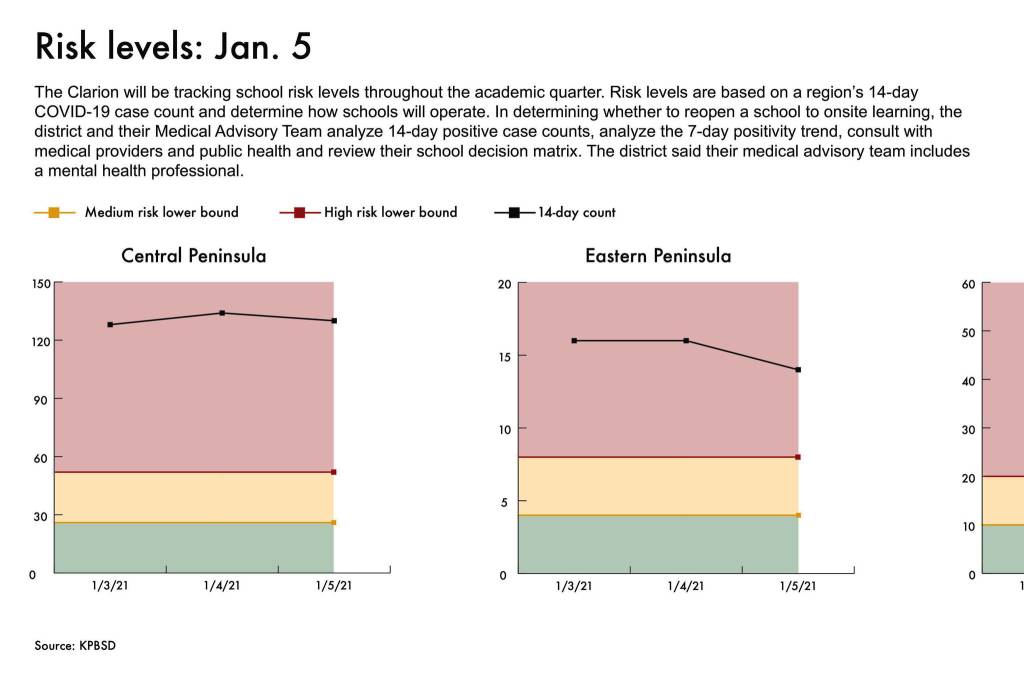 Throughout KPBSD’s winter break, which began on Dec. 18 for most schools, the 14-day case rate for all the central, southern and eastern peninsula decreased significantly, though as of Tuesday all were still at high risk. As of Jan. 5, the central peninsula needed to lose 79 cases from its 14-day case count in order to drop back into medium-risk level. The southern peninsula needed to lose 10 cases and the eastern peninsula needed to lose seven cases.