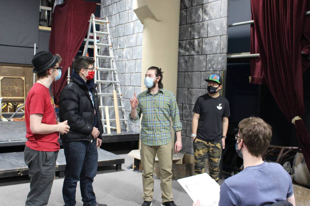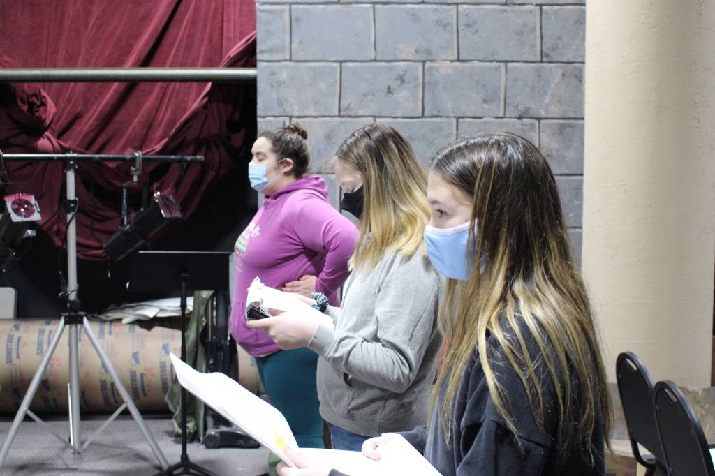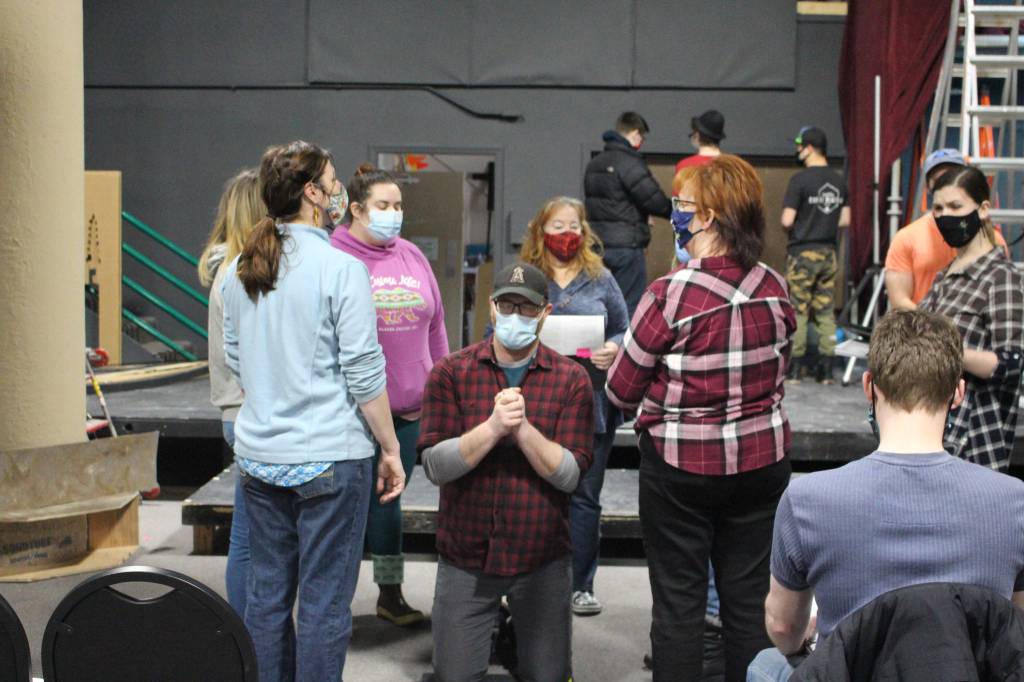 Members of local theater group Kenai Performers spent Saturday afternoon in their newly renovated black box theater behind the Subway on Kalifornsky Beach Road, rehearsing scenes from “Murder in the Cathedral,” a play by T.S. Eliot. The actors and crew were all in masks, as they will be for the actual performances, which are set for Feb. 19-21 and Feb. 26-28.