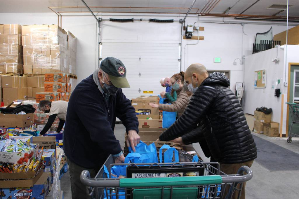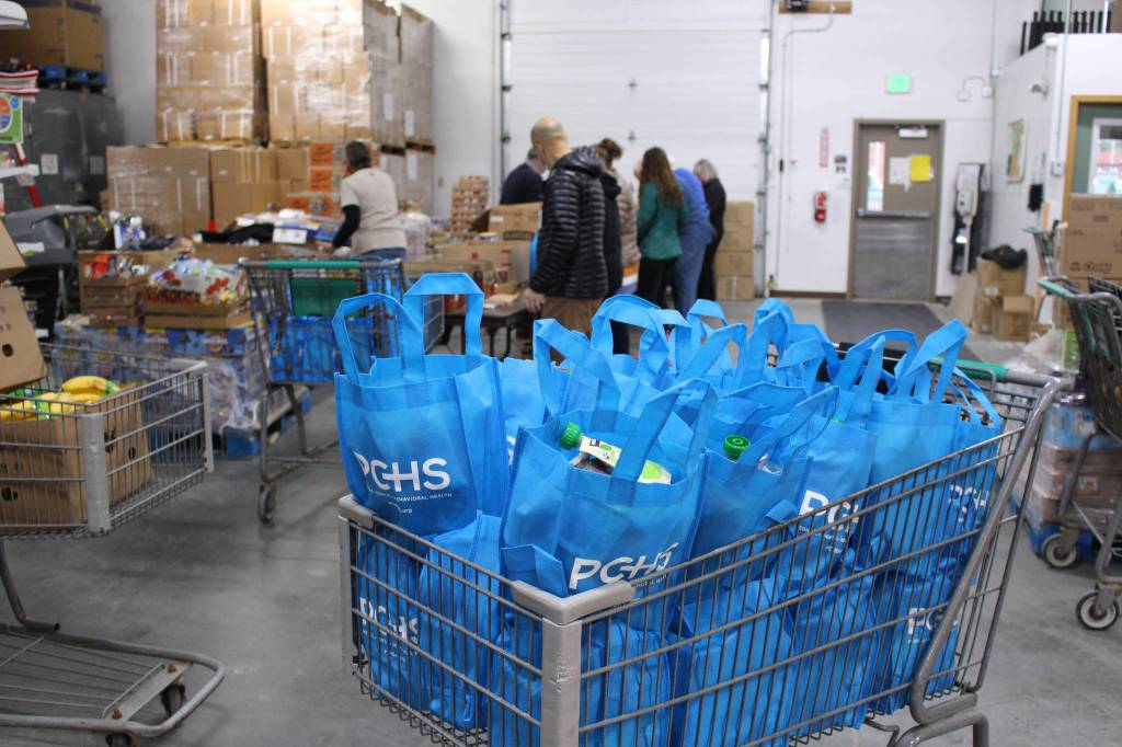 The next day, some of the same volunteers were at the Kenai Peninsula Food Bank filling blue and orange tote bags donated by PCHS with a variety of shelf-stable food. The food bank volunteers were arranged like an assembly line, efficiently placing a few items each in the bag before sending it down the line. Frank Alioto, who is the chaplain at Central Peninsula Hospital and was volunteering on Saturday, said that fellow volunteer and Fine Thyme Cafe owner Bobbi Stelljes had the idea for the assembly line.