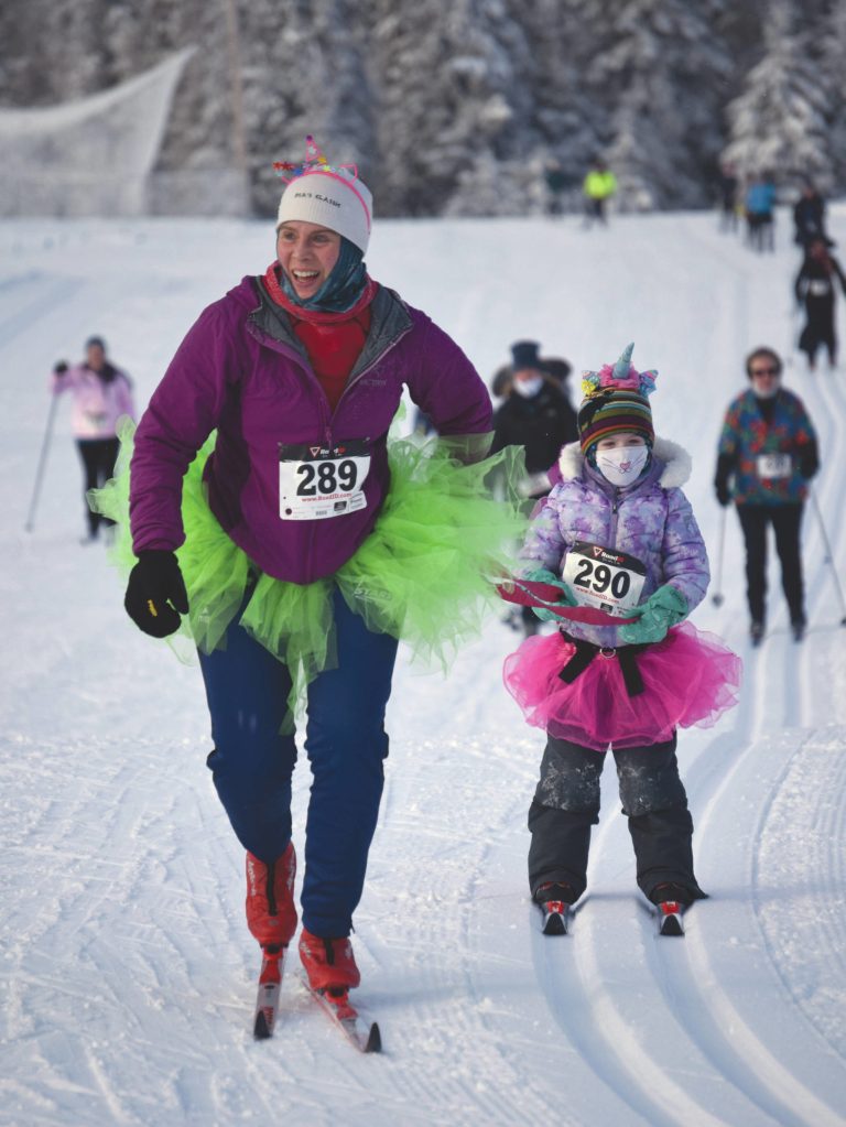 Reimer has spent many a Ski for Women at the front of the pack, but fell back this year with a good excuse. She towed her daughter, Lois, behind her.