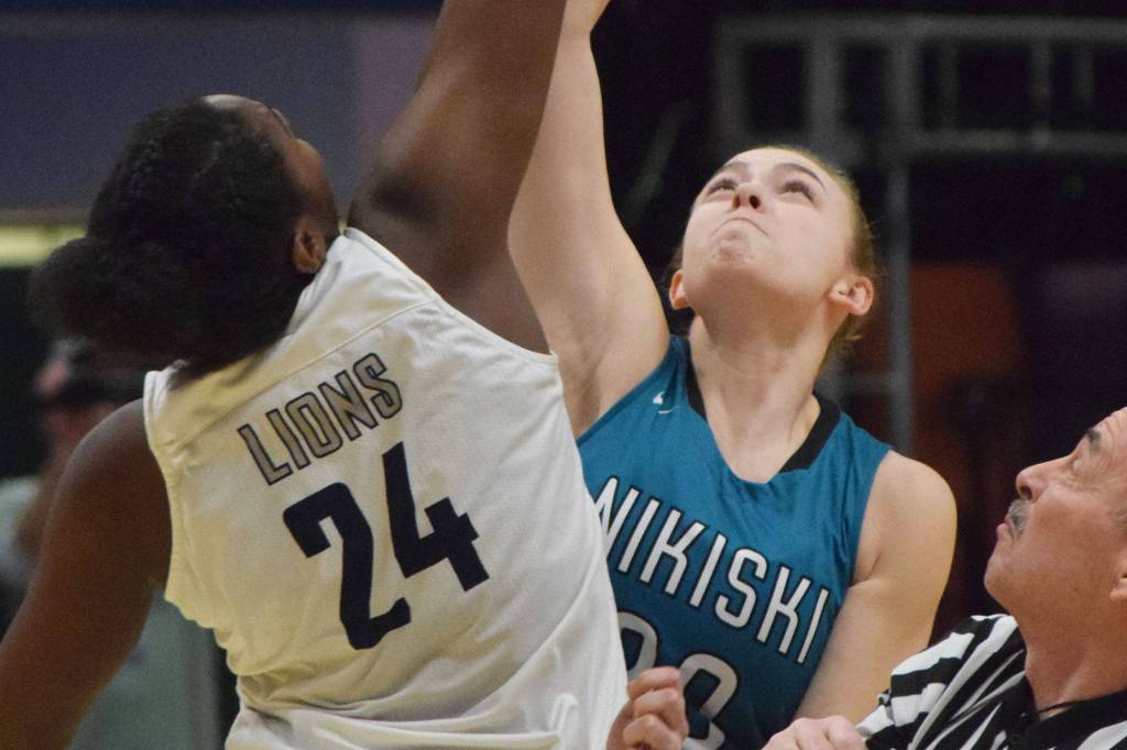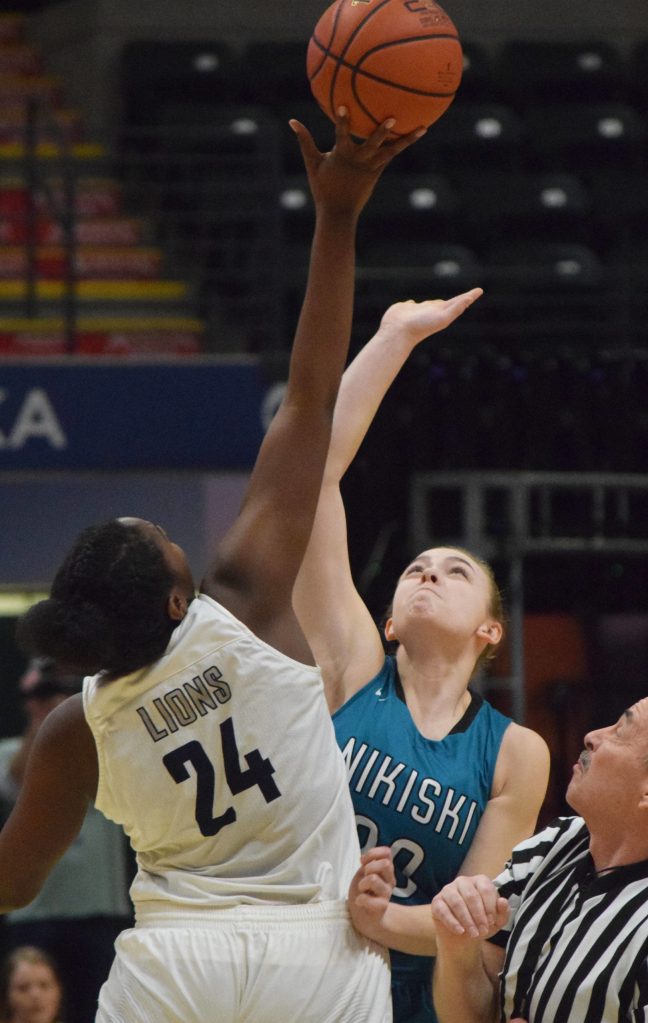Nikiski’s Bethany Carstens (right) and ACS’s Jordan Todd tip off to begin the 2019 Class 3A girls state basketball championship at the Alaska Airlines Center in Anchorage. (Photo by Joey Klecka/Peninsula Clarion)