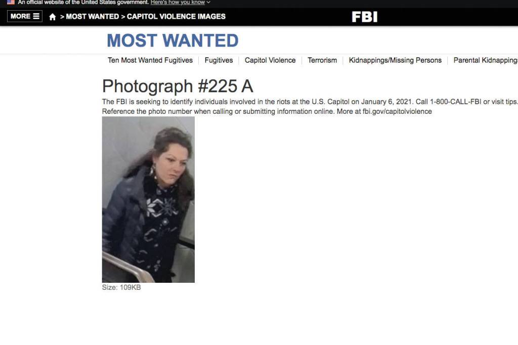 Marilyn Hueper said she later looked up the photo and that it is photograph #225a on the FBI’s U.S. Capitol Violence Most Wanted website.