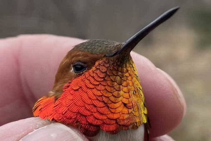 A male rufous hummingbird flashes his brilliant gorget after being captured for banding. This bird was banded in 2020 and returned to Seward for another breeding season. (Photo by Todd Eskelin/USFWS)