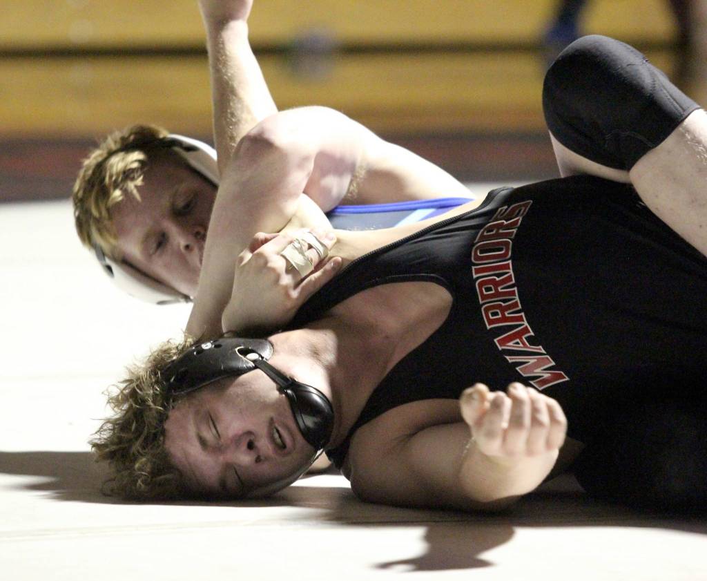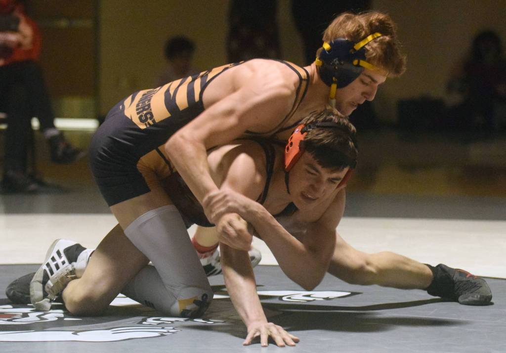 Homer’s Austin Cline defeats Kenai Central’s Owen Whicker for the title at 130 pounds at the Kachemak Conference wrestling tournament at Nikiski High School in Nikiski, Alaska. (Photo by Jeff Helminiak/Peninsula Clarion)