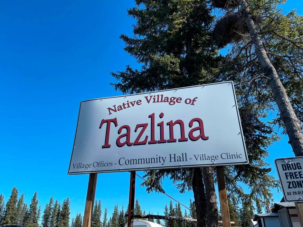 This April 22, 2021, photo, shows a sign in tiny Tazlina, Alaska, northwest of Anchorage. The Native Village of Tazlina, a federally recognized tribe, is trying to raise money so it can buy 460 acres of ancestral lands from the Archdiocese of Anchorage-Juneau. The land once held a mission school. (John Tierney / Indian Country Today)
