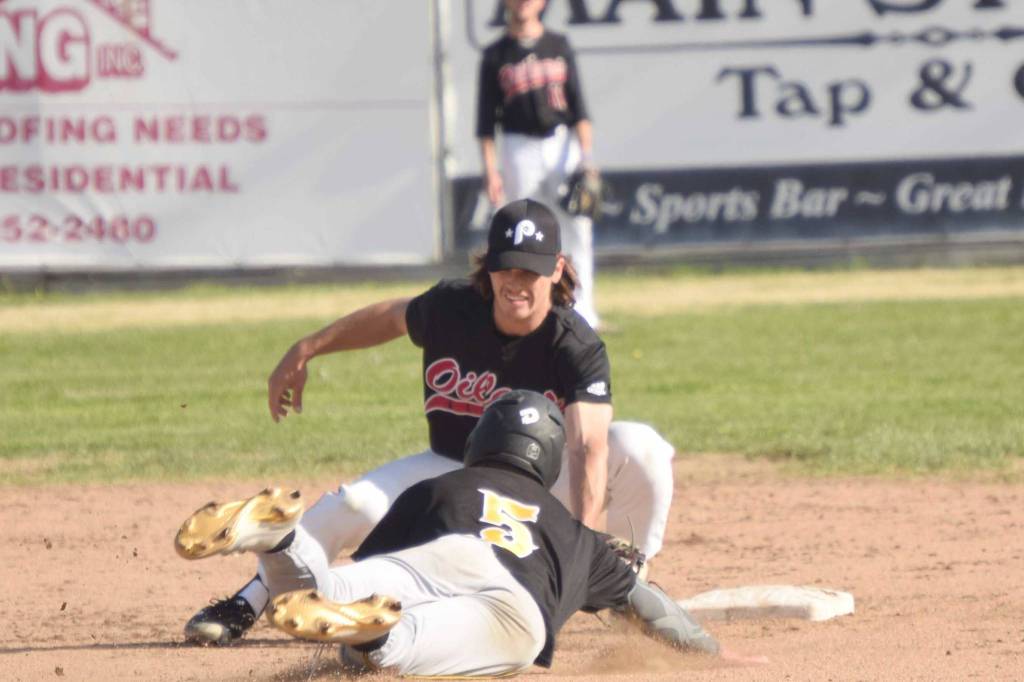 Peninsula Oilers shortstop Trevor Antonson tags out Garrett Ostrander of the Anchorage Bucs on a steal attempt Monday, June 28, 2021, at Coral Seymour Memorial Park in Kenai, Alaska. (Photo by Jeff Helminiak/Peninsula Clarion)