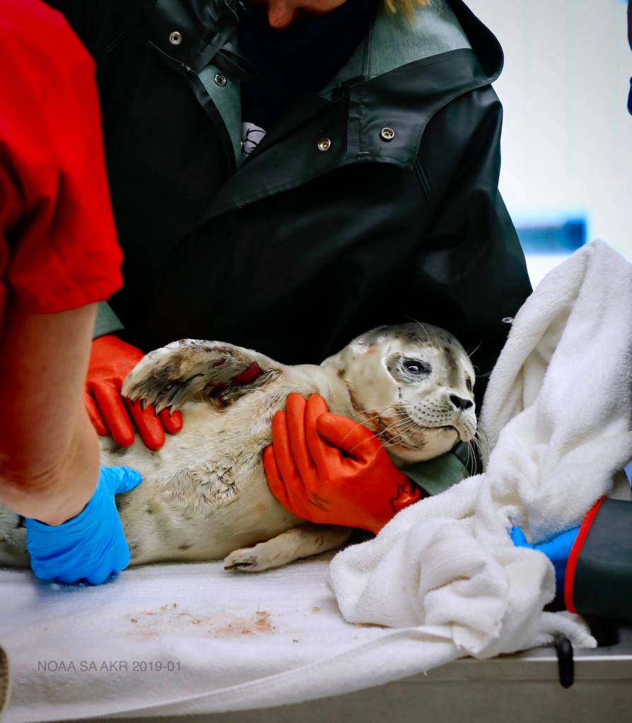 Rescuers assist an injured harbor seal pup on July 4. The pup was spotted in Resurrection Bay and taken to the Alaska SeaLife Center.