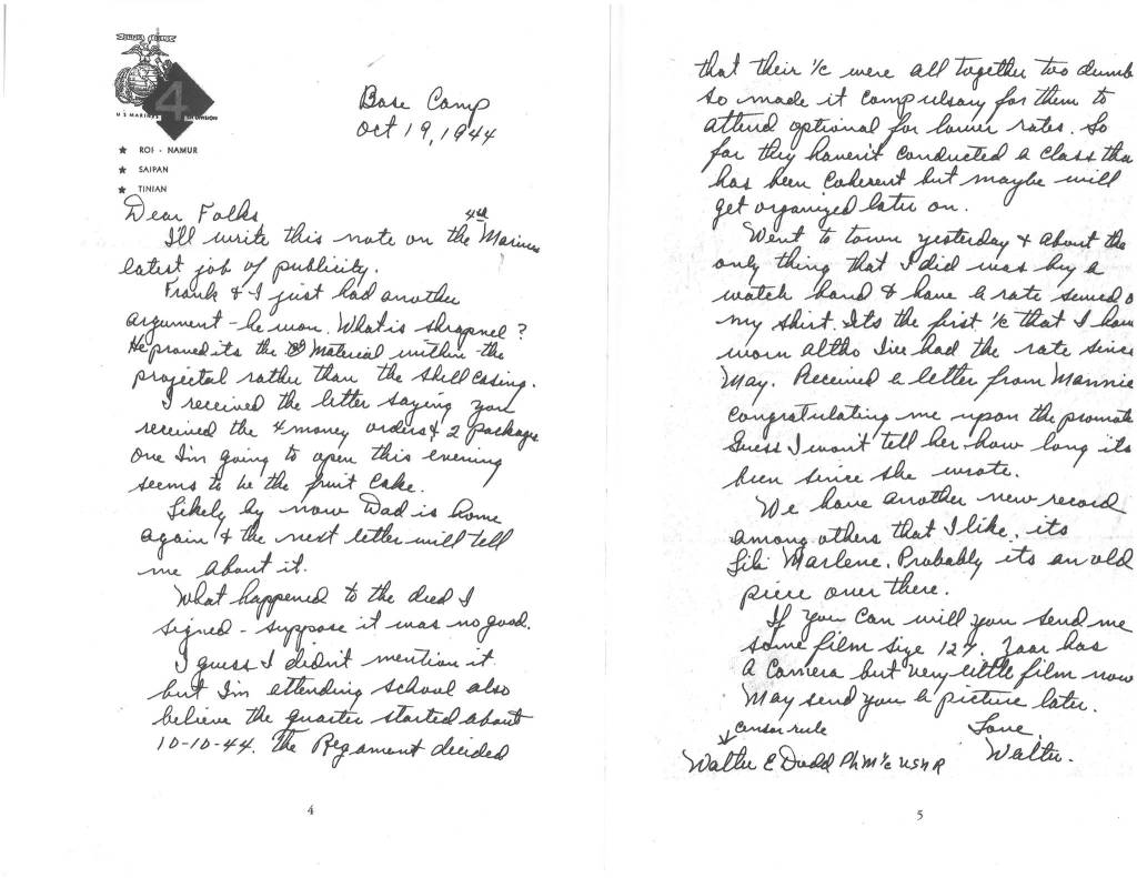 With the Marines, Walter Dodd fought in four battles, invasions of Japanese held islands at Roi-Namur, Saipan, Tinian and Iwo Jima, one of the deadliest battles of the war. Dodd received two Bronze Stars for meritorious service in combat when he rescued wounded Marines under heavy enemy fire.