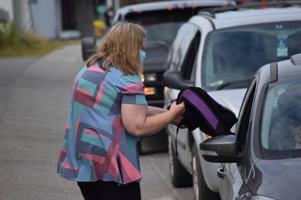 Joanne Jenkins distributes backpacks and school supplies to a line of cars at the Peninsula Community Health Services KidFest event on Wednesday, Aug. 4, 2021 in Kenai, Alaska. (Camille Botello/Peninsula Clarion)