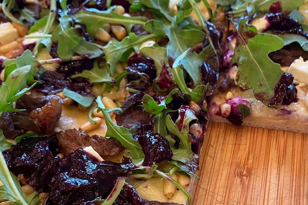 Remove from the oven and finish with arugula, pine nuts, and the blueberry relish.