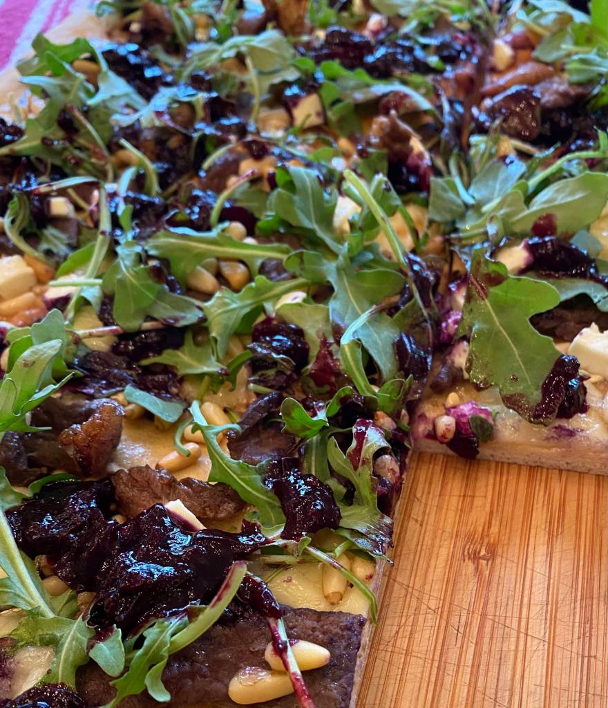 Most of our blueberries will be frozen, but while they are still fresh and so wonderfully plentiful, I am emboldened to experiment with unexpected pairings and unorthodox applications. The acidity and sweetness of the berries make them an excellent companion for creamy cheeses and fatty meats. This steak and arugula pizza with blueberry relish is as complex and delicious as it is beautiful and makes a satisfying dinner after a day of picking in the marshes or mountains.