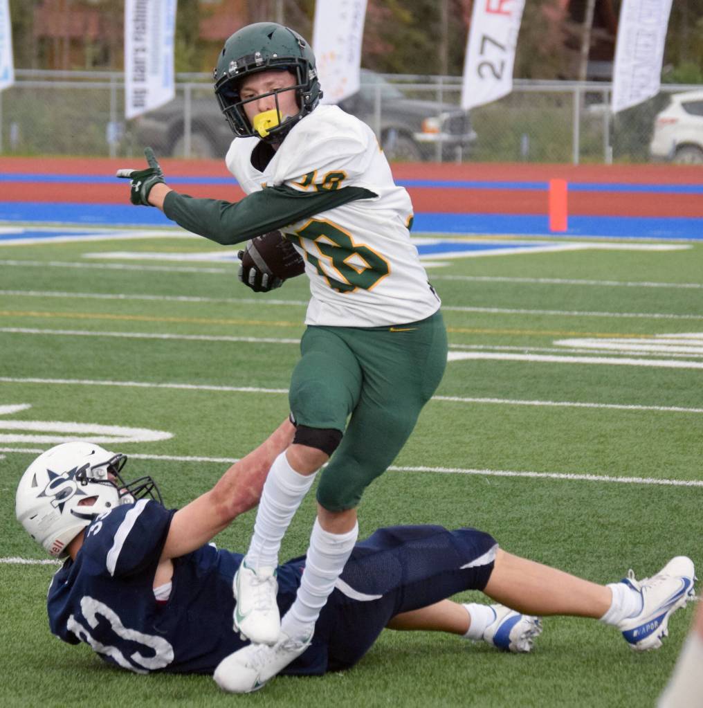 Service’s Kai Hartman is spun down by Soldotna’s Jeren Nash on Friday, Sept. 3, 2021, at Justin Maile Field in Soldotna, Alaska. (Photo by Jeff Helminiak/Peninsula Clarion)