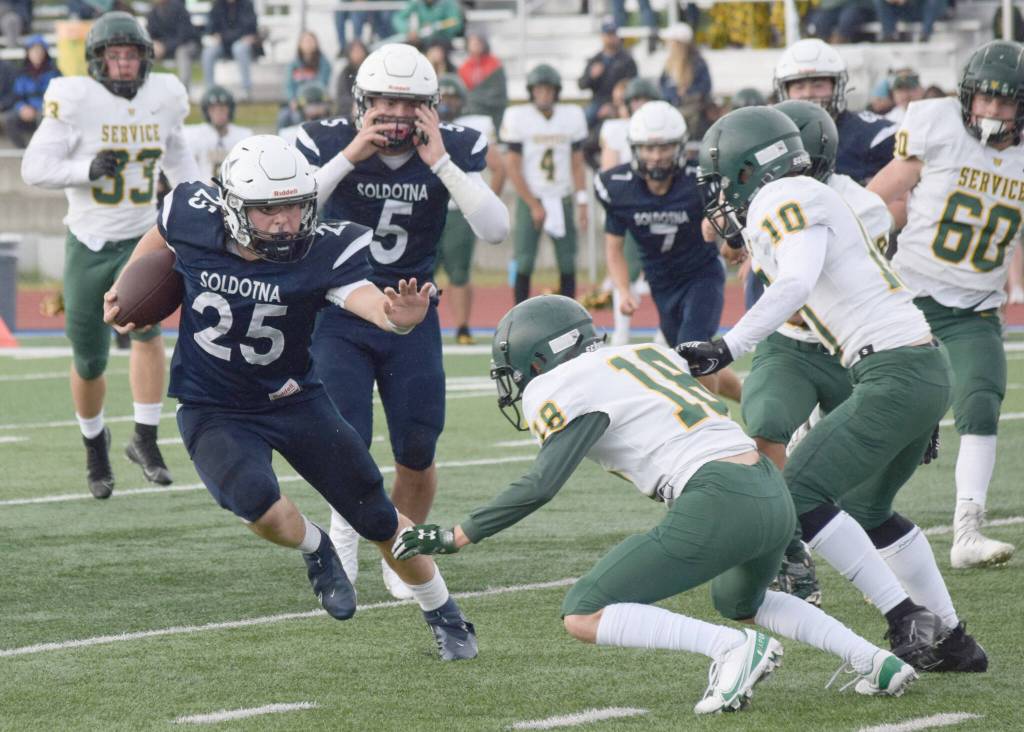 Rushing — Service: Reape 19-136, O’Farrell 5-38, Smith-Thomas 4-14, Potson 1-6, Niclai 2-0. Soldotna: Medcoff 25-231, Wilson 18-111, Mellon 6-67, Taylor 3-31, Buckbee 5-10, Faircloth 1-4.