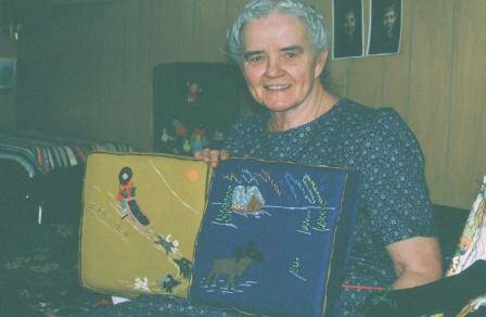 In addition to finding their way to almost every state, her pillows journeyed, via friends to South America, Africa, Europe, Iceland and Turkey. Their theme never varied but always portrayed colorful Alaska traditions, often against a backdrop of moss greens, glacier blues, Nome gold or black winter darkness.