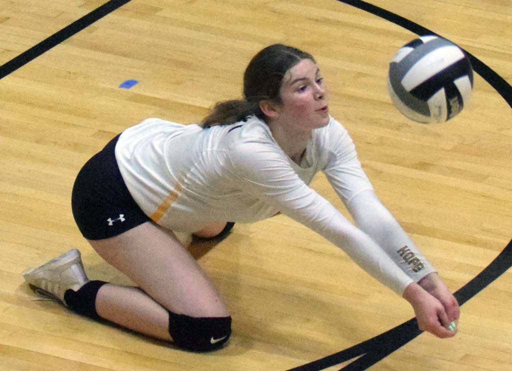 Nikiski’s Jaycee Tauriainen digs up a ball from Soldotna on Tuesday, Sept. 14, 2021, at Nikiski Middle-High School in Nikiski, Alaska. (Photo by Jeff Helminiak/Peninsula Clarion)