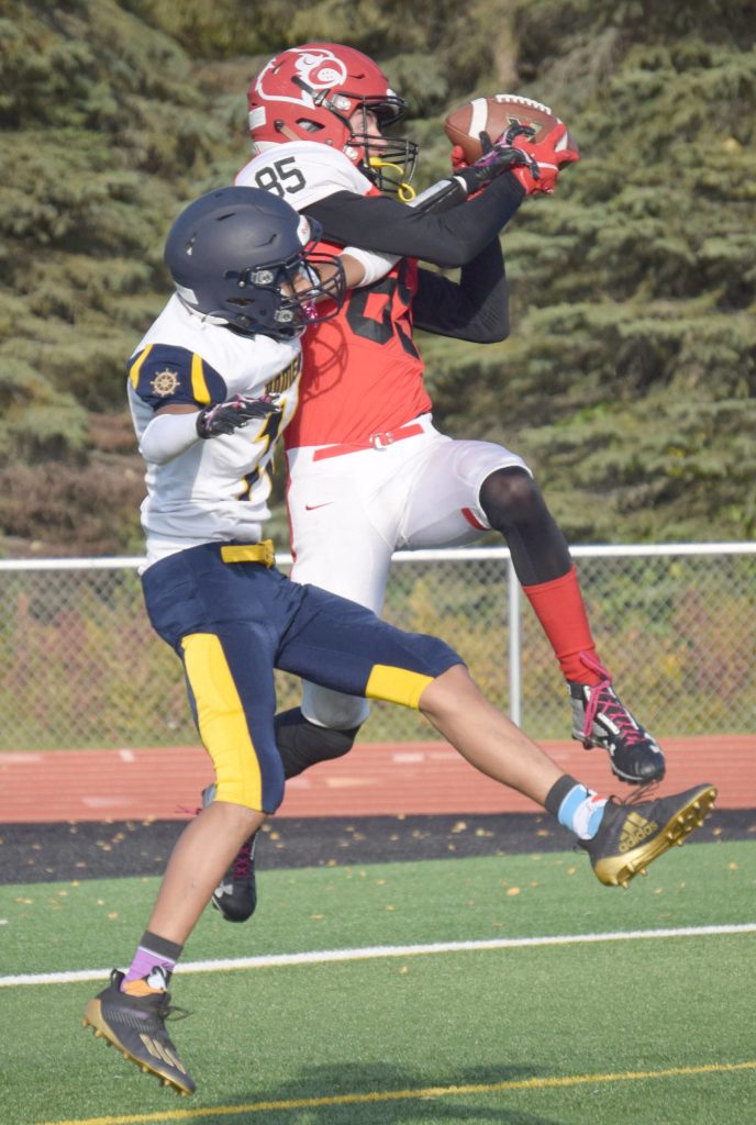 Kenai Central’s David Martin catches a touchdown on Homer’s Morgen Techie on Friday, Sept. 17, 2021, at Ed Hollier Field in Kenai, Alaska. (Photo by Jeff Helminiak/Peninsula Clarion)