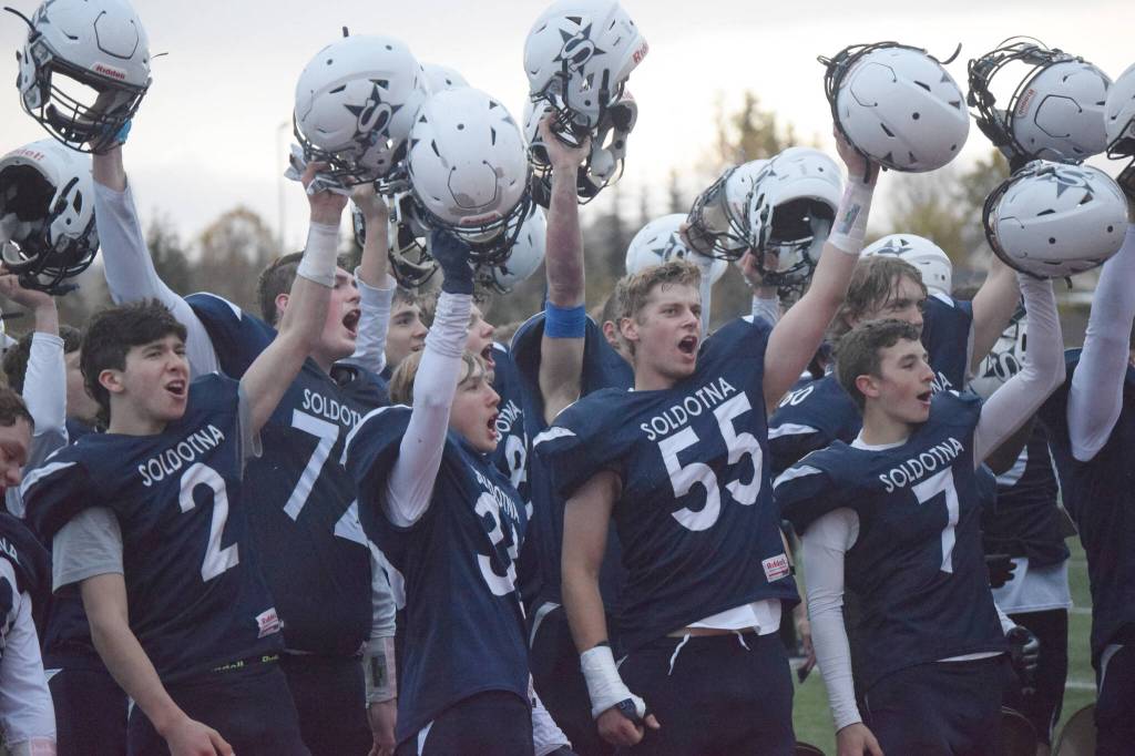 Soldotna celebrates its victory over North Pole in the Division II semifinals Friday, Oct. 8, 2021, at Justin Maile Field in Soldotna, Alaska. (Photo by Jeff Helminiak/Peninsula Clarion)