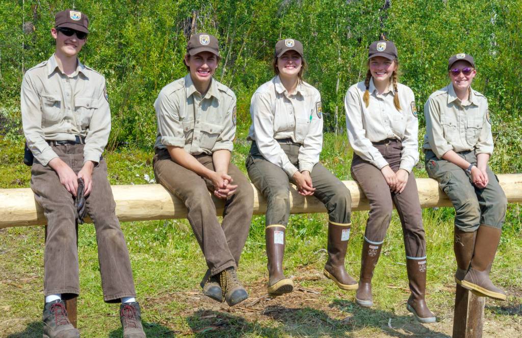 The 2021 YCC Crew sits on a newly constructed hitching post at Nurses Cabin in July 2021. Left to right are Ryan Crapps, Jacob Begich, Leah Fallon, Melita Efta and Olivia Somers. (Photo by USFWS/Heather Sokul)