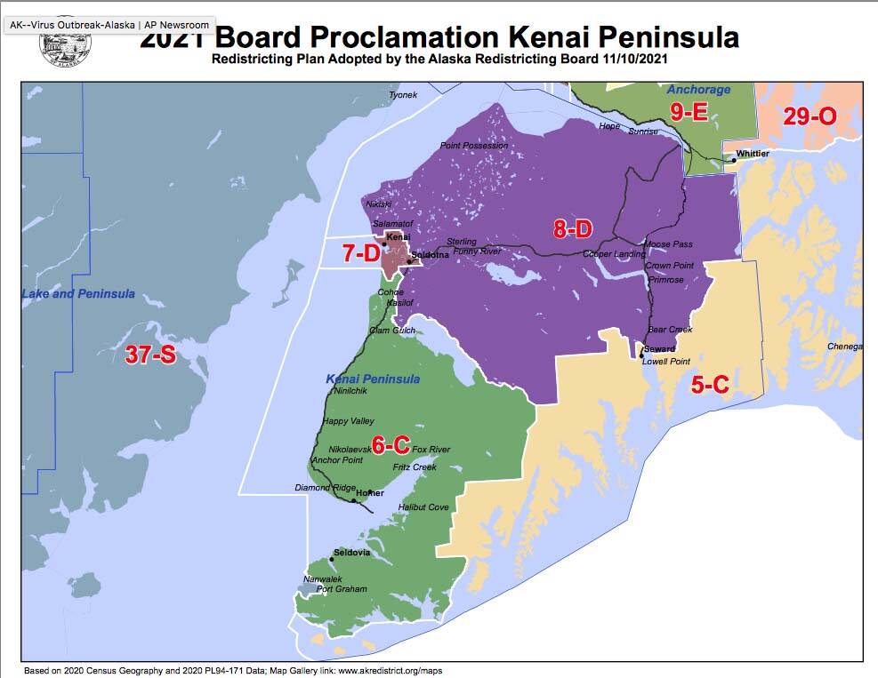 The 2021 Board Proclamation for the Kenai Peninsula shows the redistricting plan adopted by the Alaska Redistricting Board on Nov. 10, 2021. (akredistrict.org)